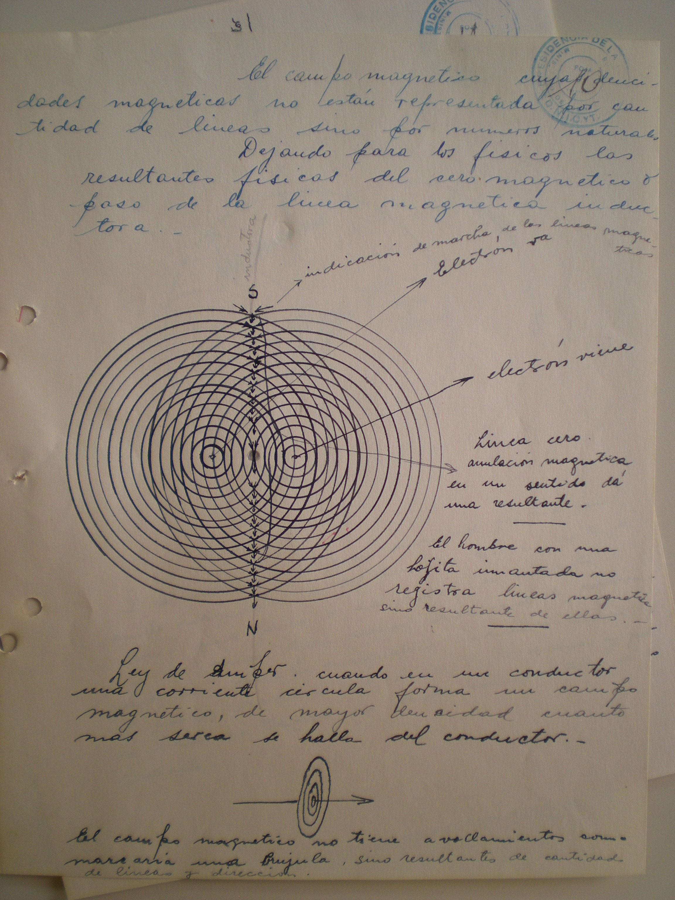 Esta va con el fin único de pedirle Ud., y a la vez de exponerle lo sigiuente: por falta de ayuda no he podido perfeccionar un invento el cual lleva por nombre “PISTOLA ELECTRONICA” el cual por la gracia, que pedido hice al alma (q.e.p.d.) de la señora Evita la cual vi yo concedida el dia 26 de Septiembre próximo pasado, dia tan dichoso para mi que vi colmada s mis aspiraciones, descubriendo el secreto de como puede ser desintegrado cualquie cuerpo.