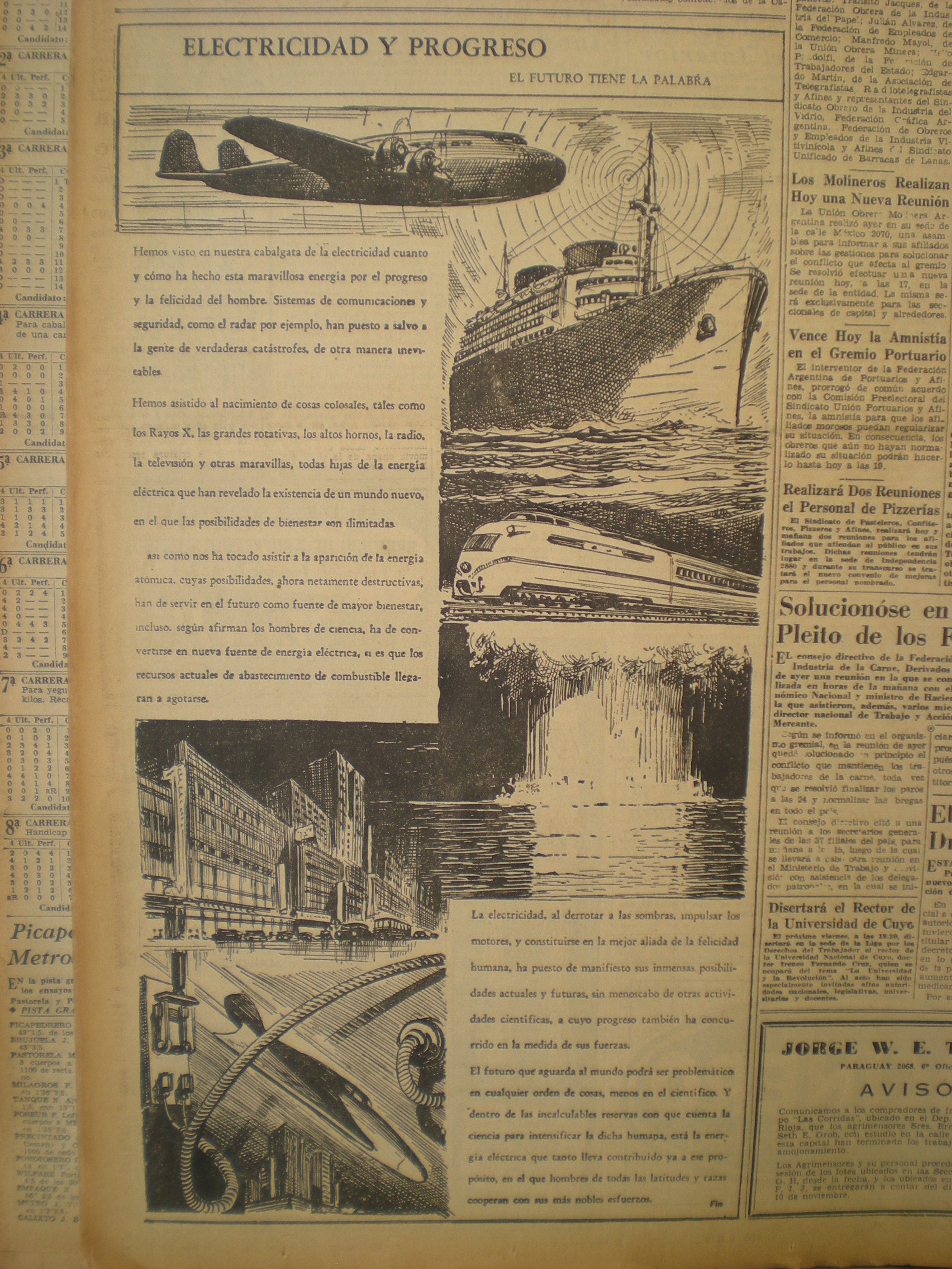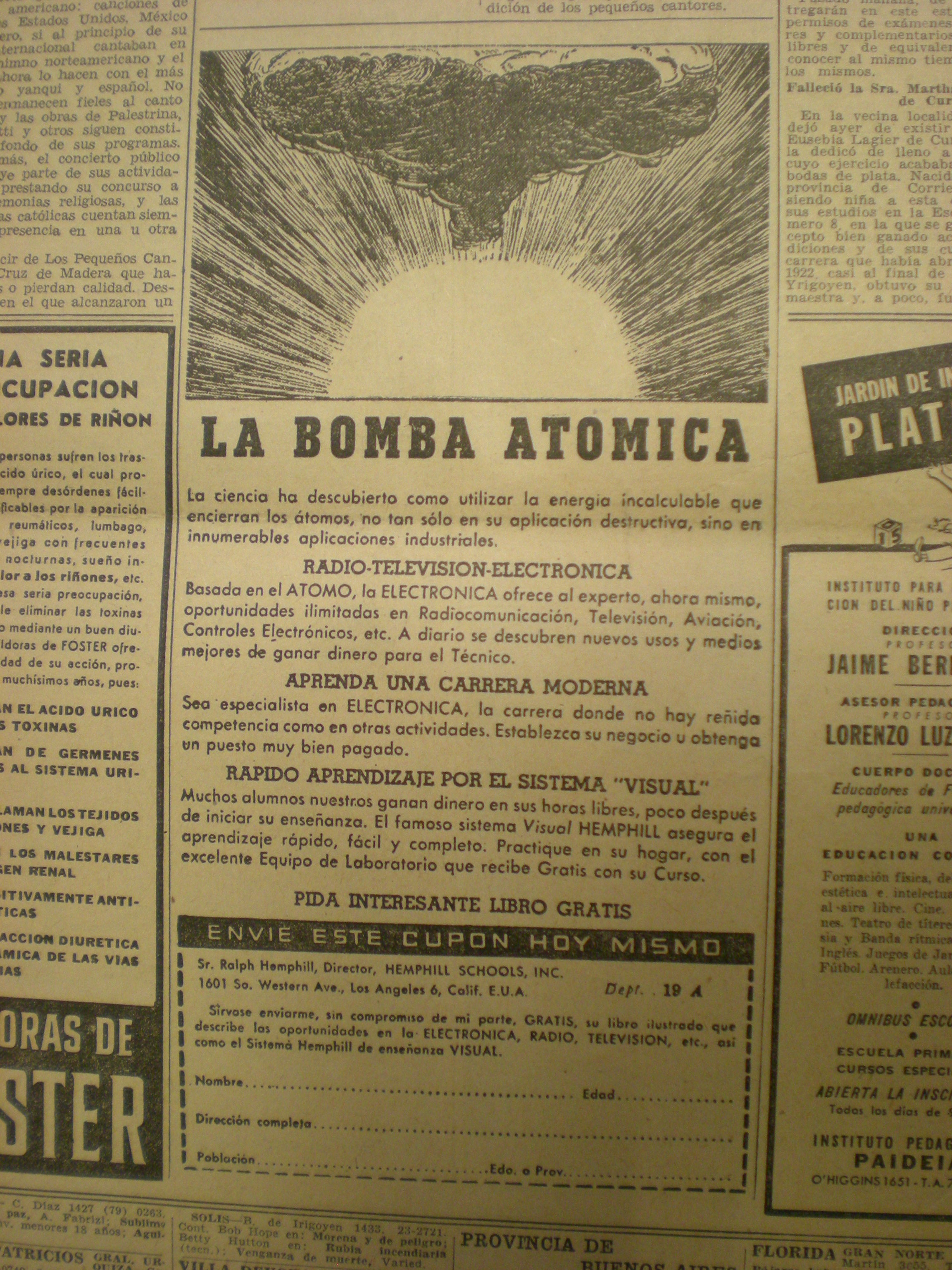 “LA BOMBA ATÓMICA, contra los altos precios…”, el caballo que en marzo de 1948 ganó el Premio Municipal en el Hipódromo de Buenos Aires había sido bautizado Uranio, y en 1949 una campaña de divulgación titulada “Electricidad y Progreso” incluía la energía atómica (junto a los rayos X, –ver capítulo de Soledad Quereilhac en este volumen-) en “el nacimiento de cosas colosales” durante el último siglo; también llevó como título “LA BOMBA ATÓMICA” la publicidad de un curso de electrónica por correspondencia con sede en Estados Unidos18. La revista de divulgación científica y ciencia-ficción Más Allá (ver capítulo de Ana Grondona en este volumen), por su parte, se promocionaba como “la revista de la era atómica”, y la película Las aventuras de Superman se presentaba en la Argentina como “[u]na serie colosal […] de proporciones superatómicas!”19.