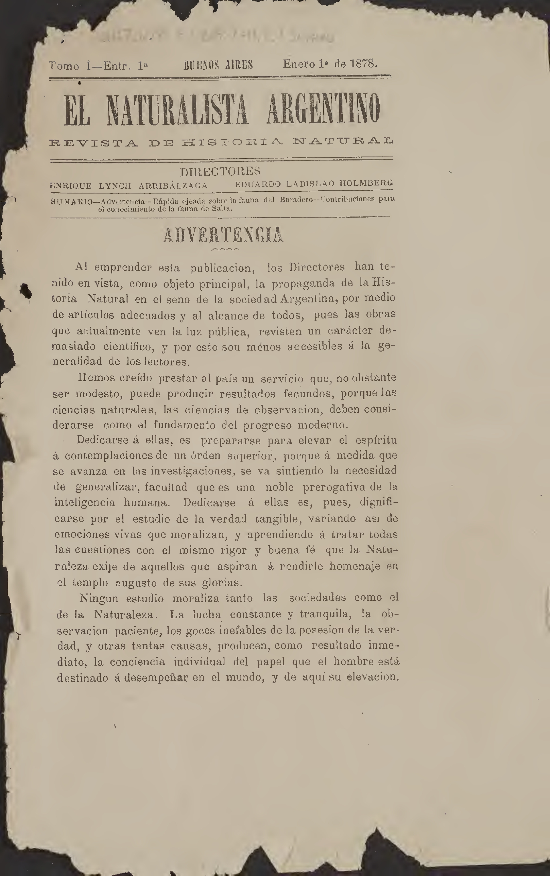 El Naturalista Argentino. Revista de Historia Natural/Directores/Enrique Lynch Arribálzaga y Eduardo Ladislao Holmberg/Aparece el 1° de cada mes/Enero 1° de 1878/ Buenos Aires/Imprenta de Lynch y Saavedra, Calle de Maipú, número 211, Año 1878.