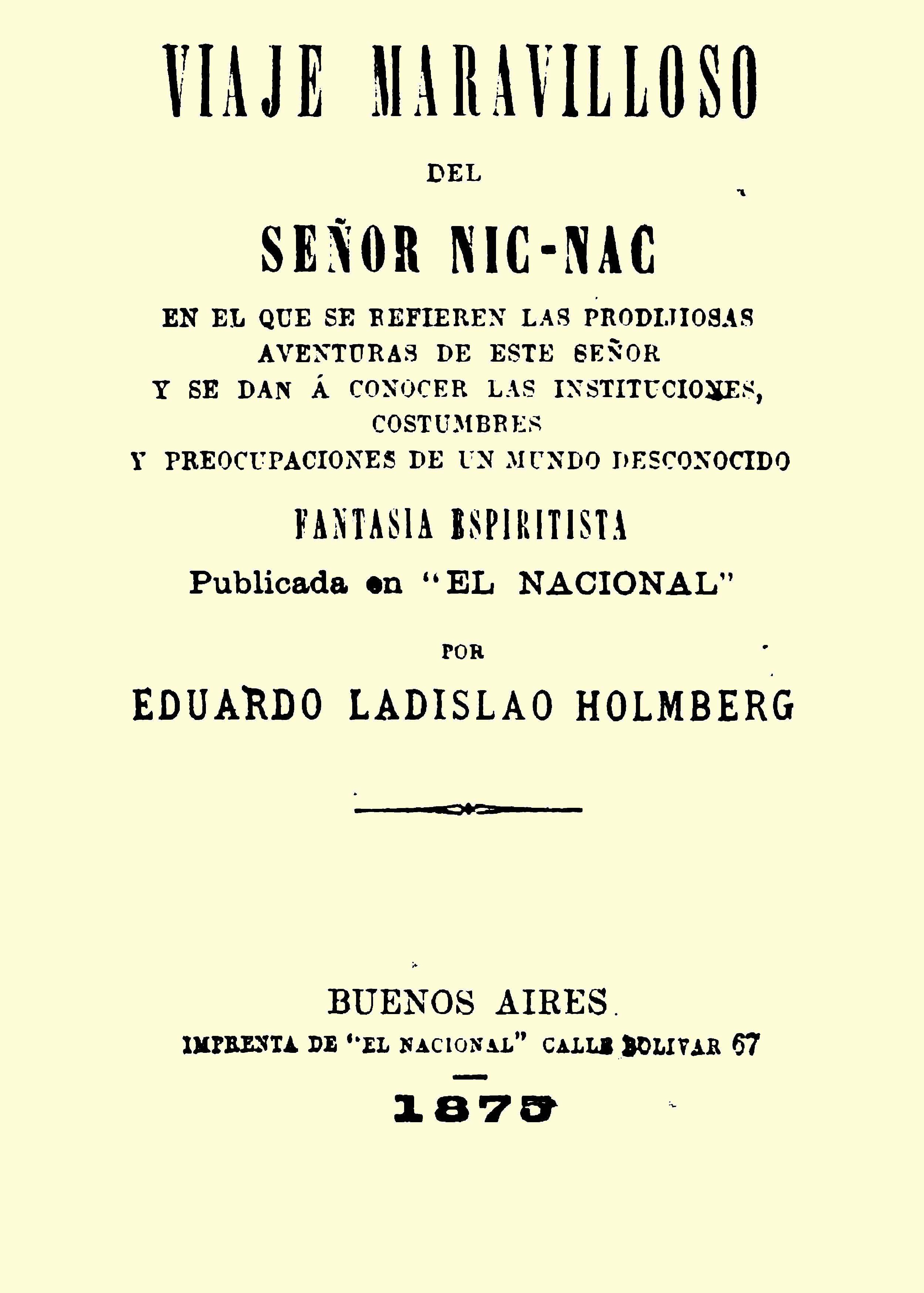 Holmberg, Eduardo L. (1875b), Viaje maravilloso del Señor Nic-Nac, Buenos Aires: Imprenta de El Nacional.