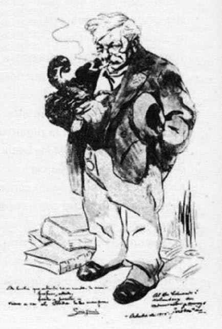 En esta caricatura del dibujante español Cao, publicada en la revista Caras y Caretas en 1900, Eduardo Ladislao Holmberg (1852–1937) aparece como una figura desalineada a la vez que atractiva: insectos y víboras salen de sus bolsillos, sostiene una jaula habitada por un águila de contornos prusianos, y está rodeado por una bolsa repleta de huesos, mientras un caracol se acerca a sus pies.